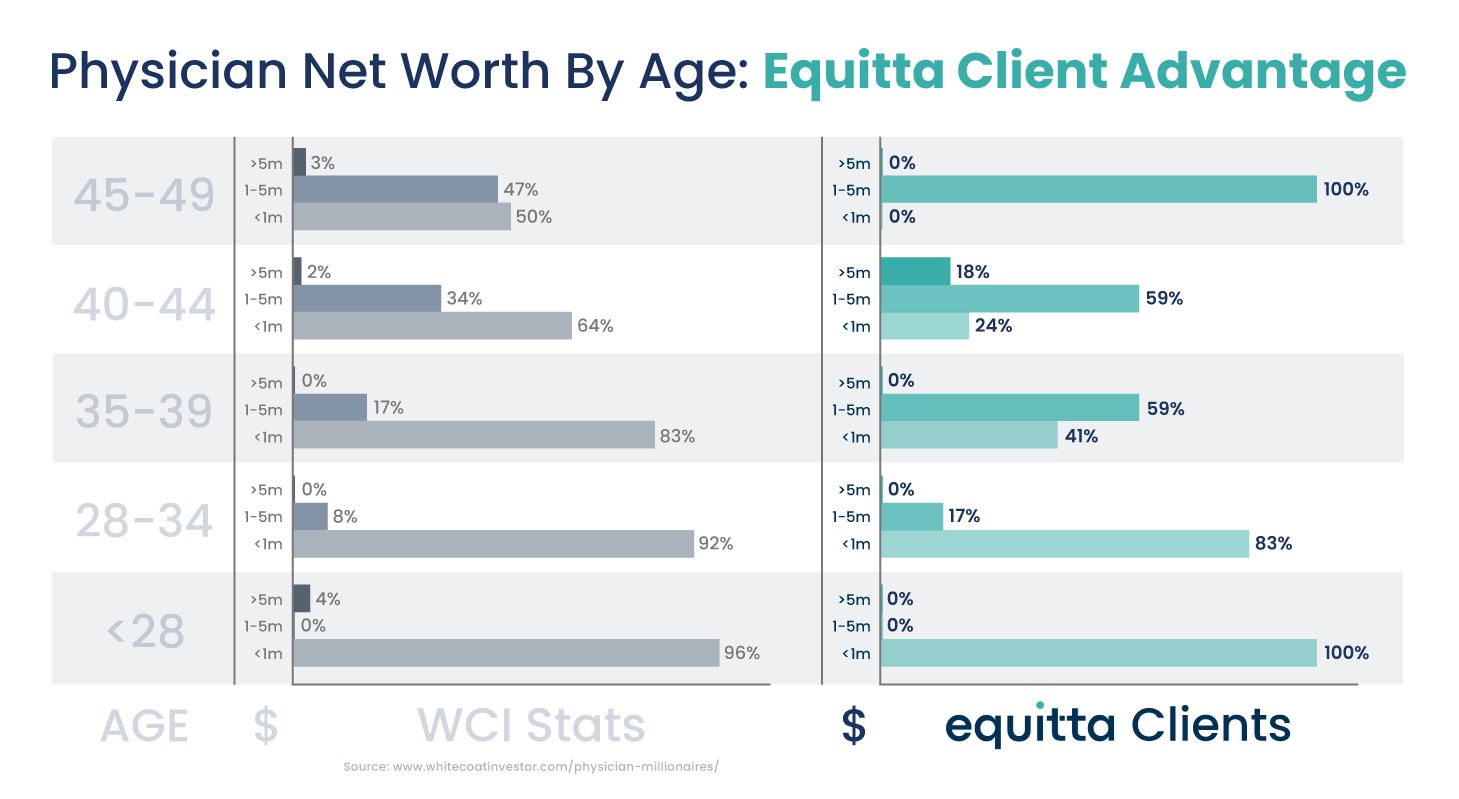 Finally, it is worth noting that there’s no definitive way to attribute our clients’ financial success solely to our guidance—and it would be academically dishonest to claim otherwise. It’s entirely possible that more financially minded physicians are the ones seeking financial advice from firms like Equitta (and that these physicians may have reached higher net worth tiers on their own, without an advisor). The reality is, it’s likely a combination of both: financially minded physicians paired with the support of a competent advisor. Still, the results for Equitta clients relative to the WCI data is compelling and consistently shows improved financial outcomes.